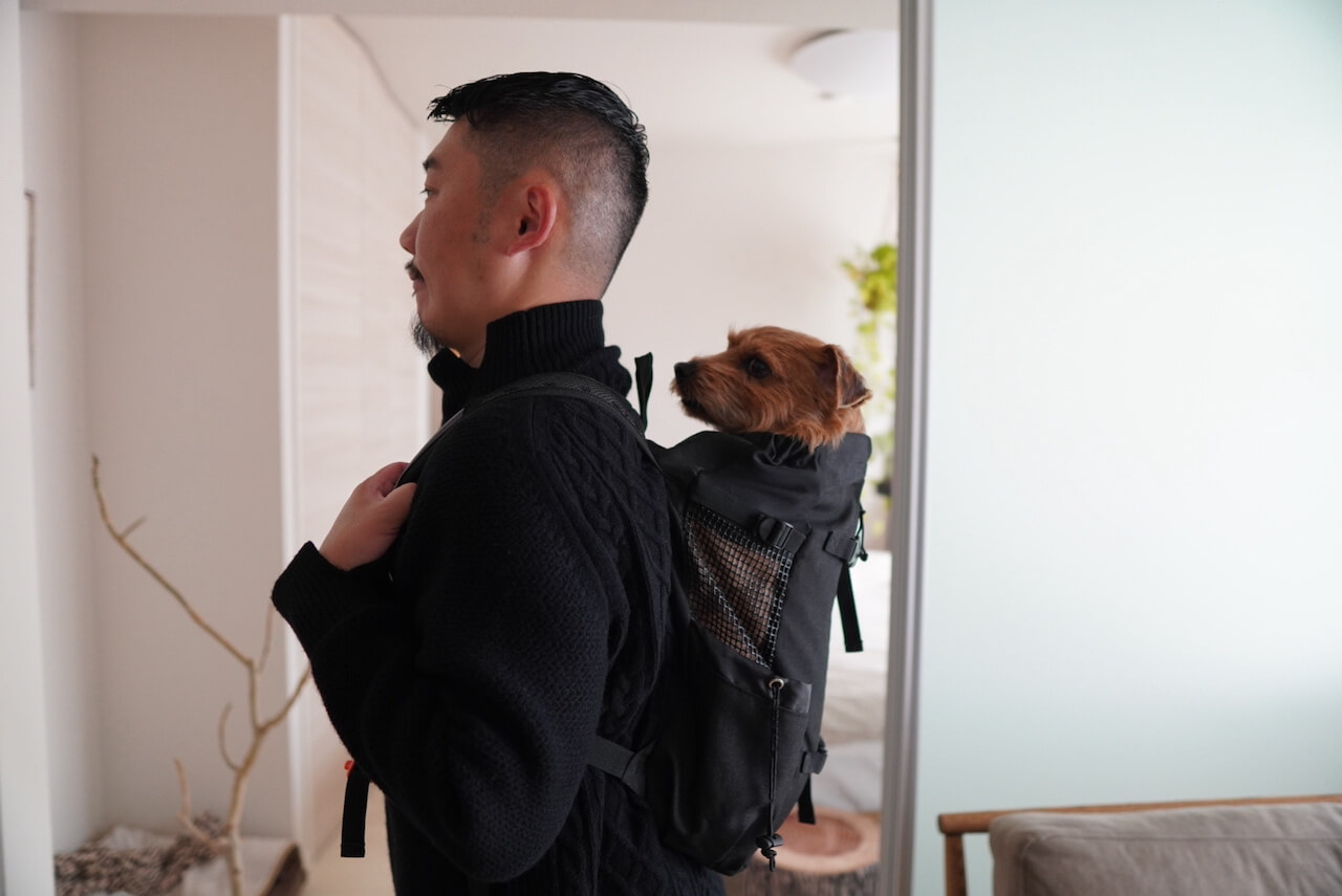 バズの体重は約7kgほどあるので、長時間になるとスリングよりもリュックの方が犬の体重が均等に分散されるので、体への負担も少なめだ。
