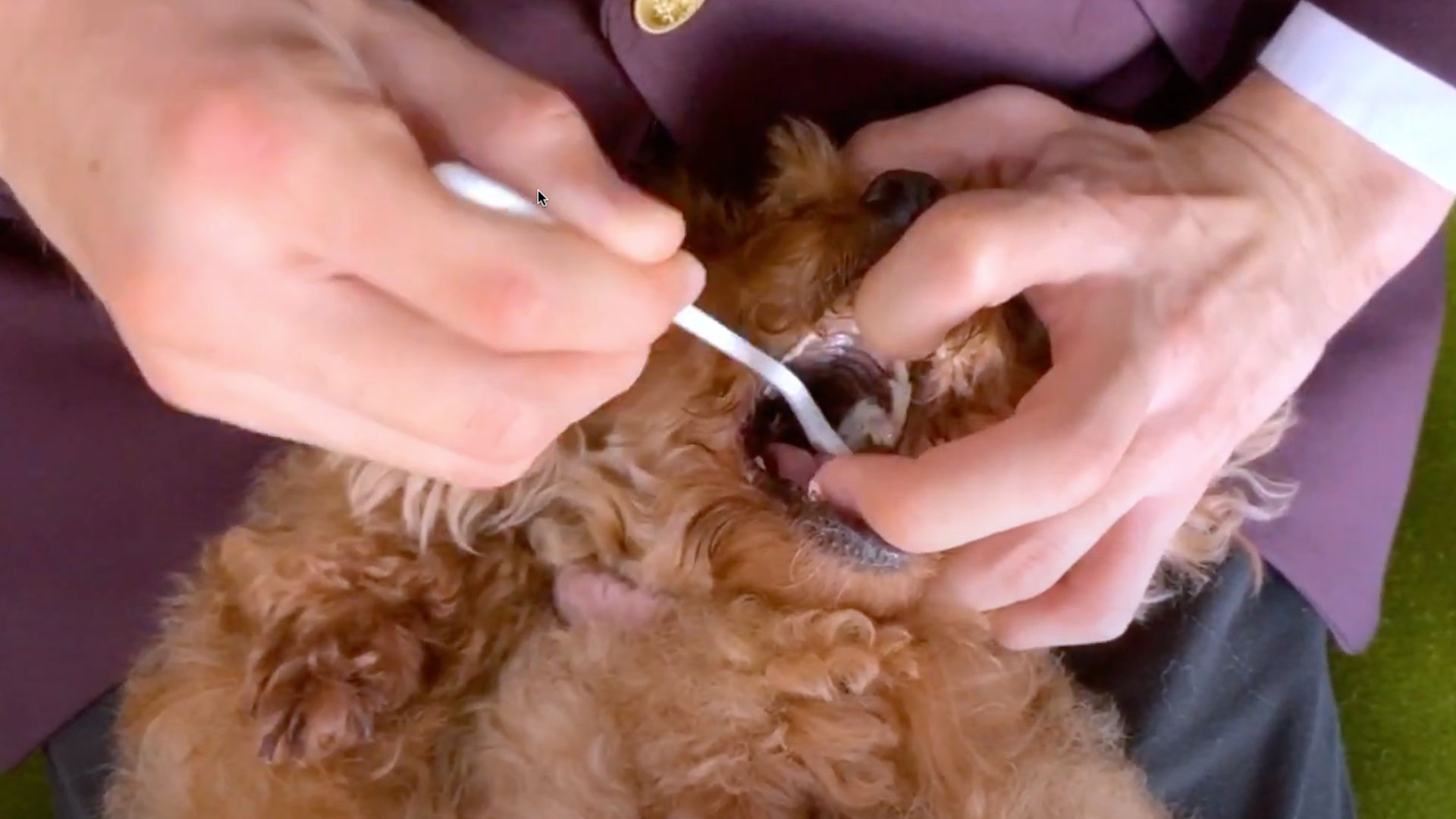 耳の中、鼻先や目尻を触り、口は唇をめくって頂いて、口の中全体もさわりましょう。