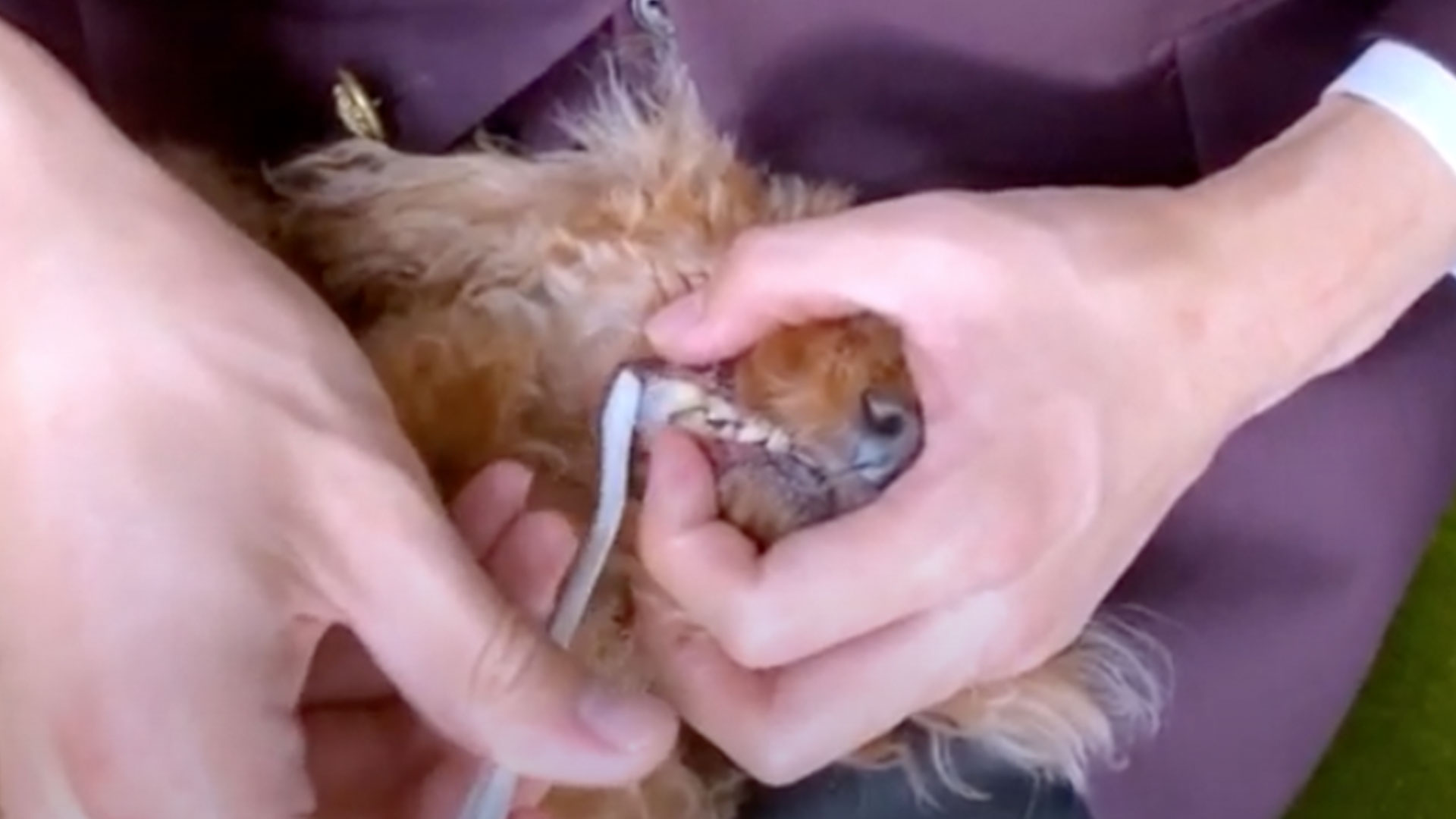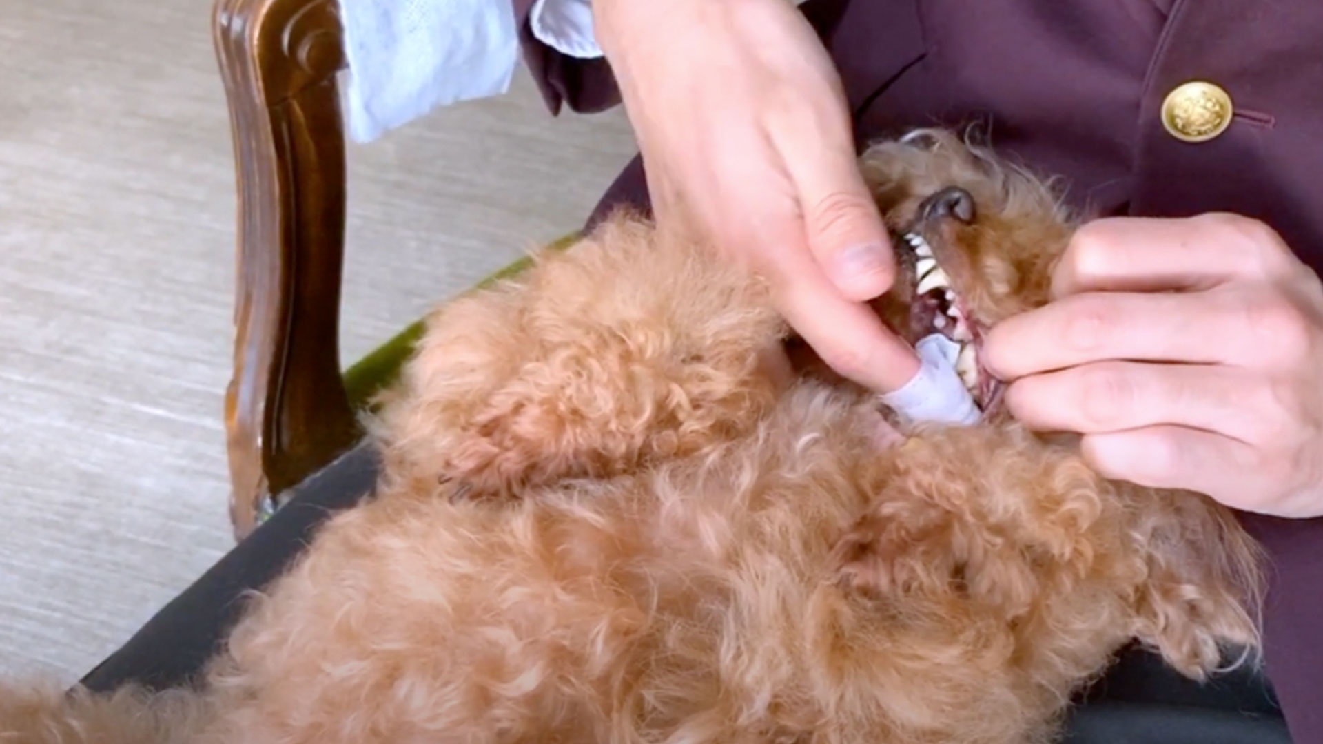 まず犬の口を少し開けて、人差し指と中指を前歯の中に入れます。