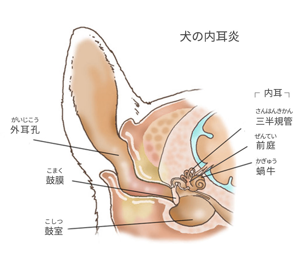 外耳炎が進行して鼓膜に穴が開き、炎症が中耳・内耳まで広がった細菌感染が原因になることが多いです。