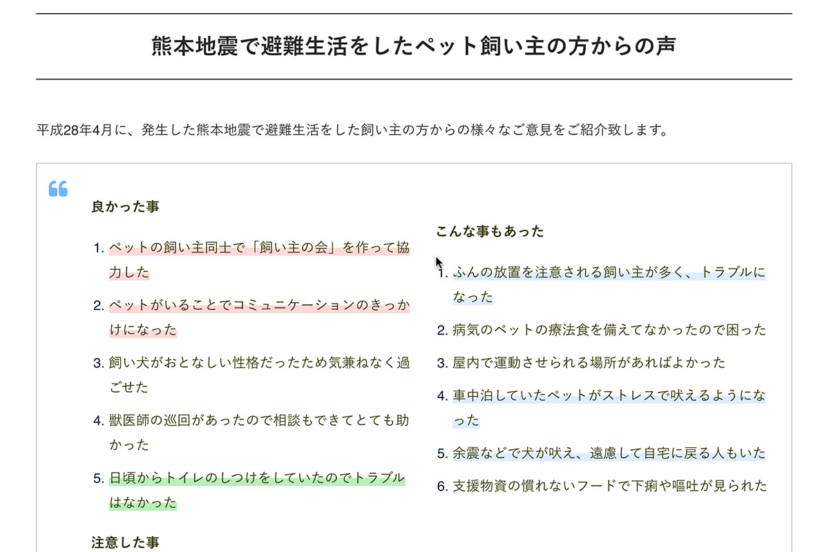 実際に、熊本地震で避難生活をしたペットの飼い主様からの声をまとめた物が、概要欄にありますので、是非ご覧ください。