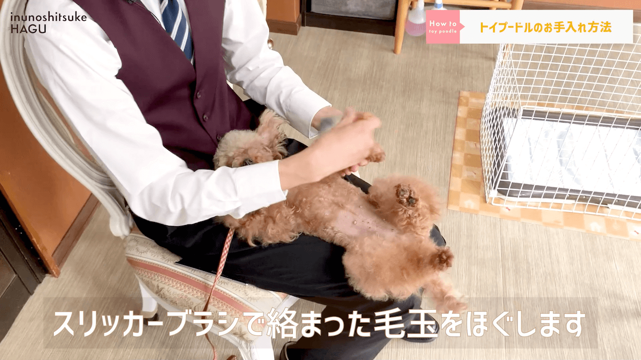 トイプードルの毛のお手入れは、まず最初にスリッカーブラシで毛並みに沿って全身の毛をほぐしてください。