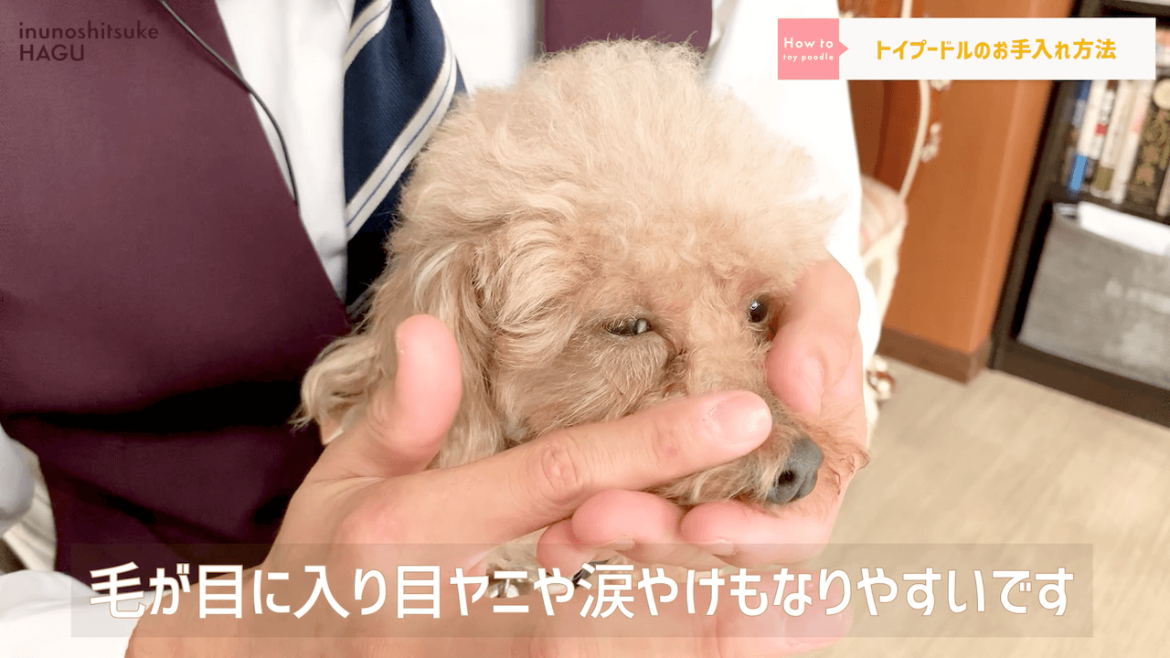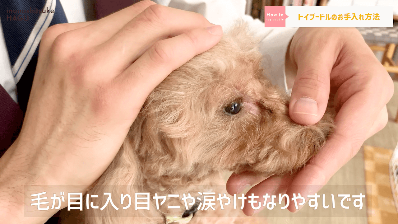 毛がくるくるしているので目に入りやすく、目やにや涙やけしやすい犬種です。