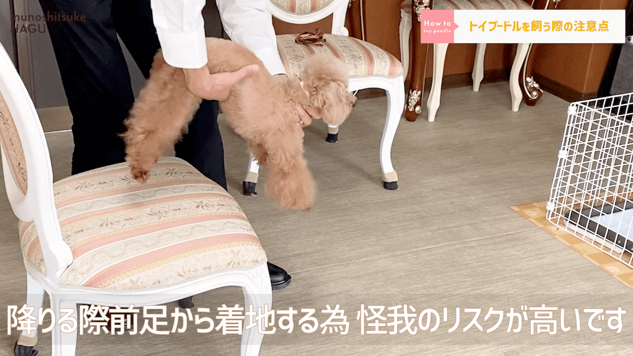 トイプードルは、高いところに乗ることが好きですが、降りる時に前脚を