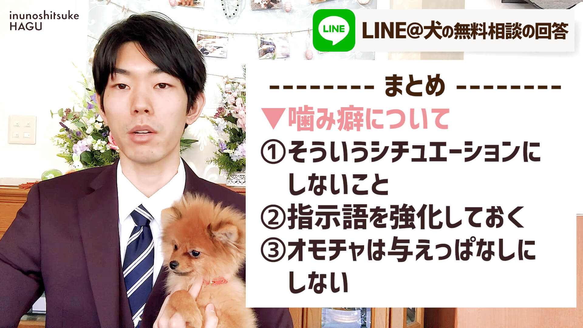 噛みついたりする行動は今のところ無いとの事ですが、今後噛むという行動を起こさせない為の対応としては、そういうシチュエーションを作らないことが大事です。