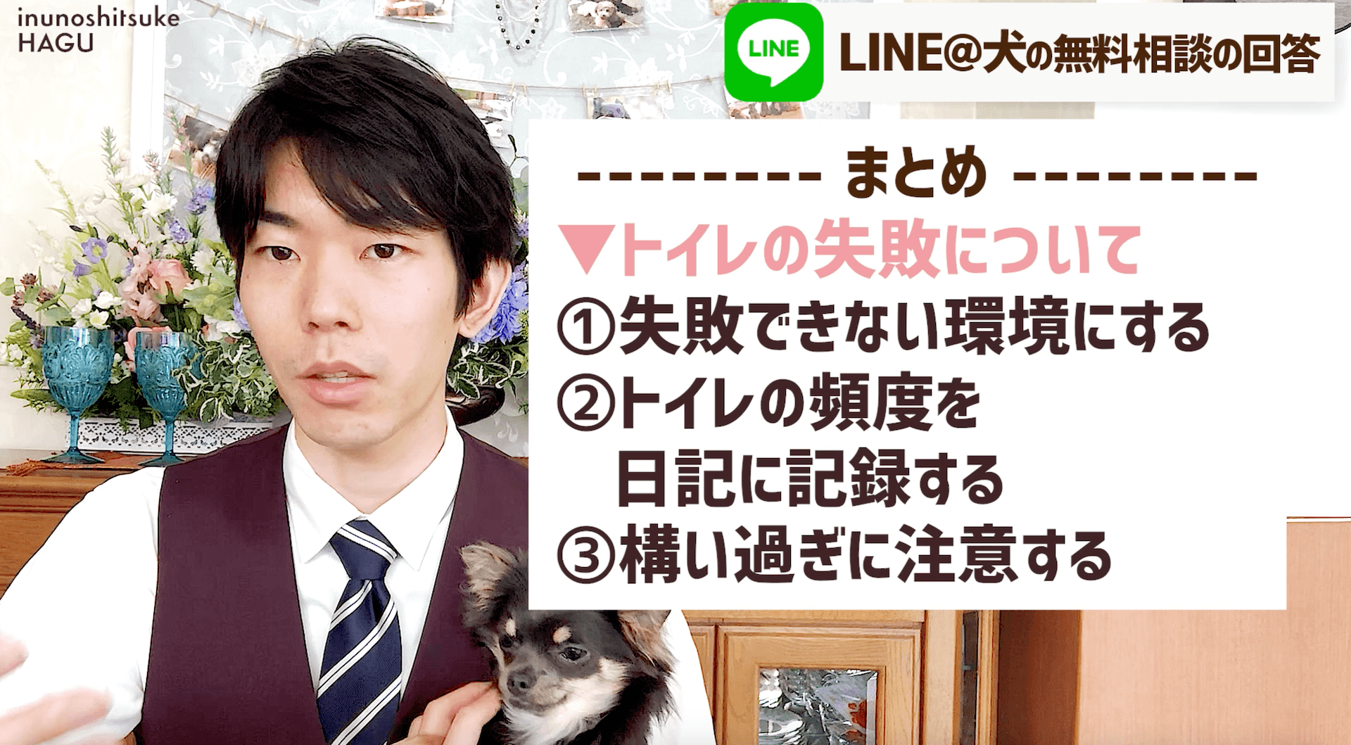トイレの管理を徹底して頂いて、失敗のないように導いてあげて頂きたいと思います。
