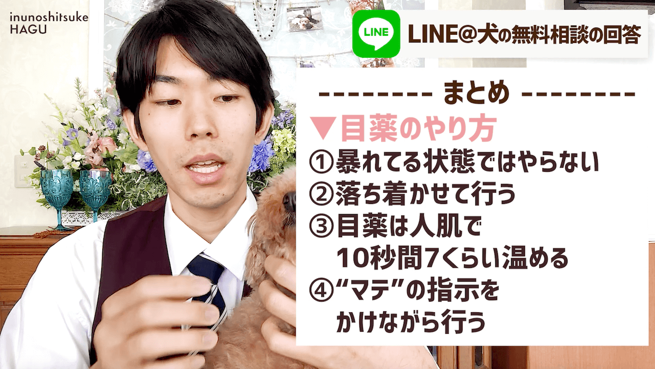 目薬を差す時には、マテの指示をかけながら、褒めながら行うようにして下さい。