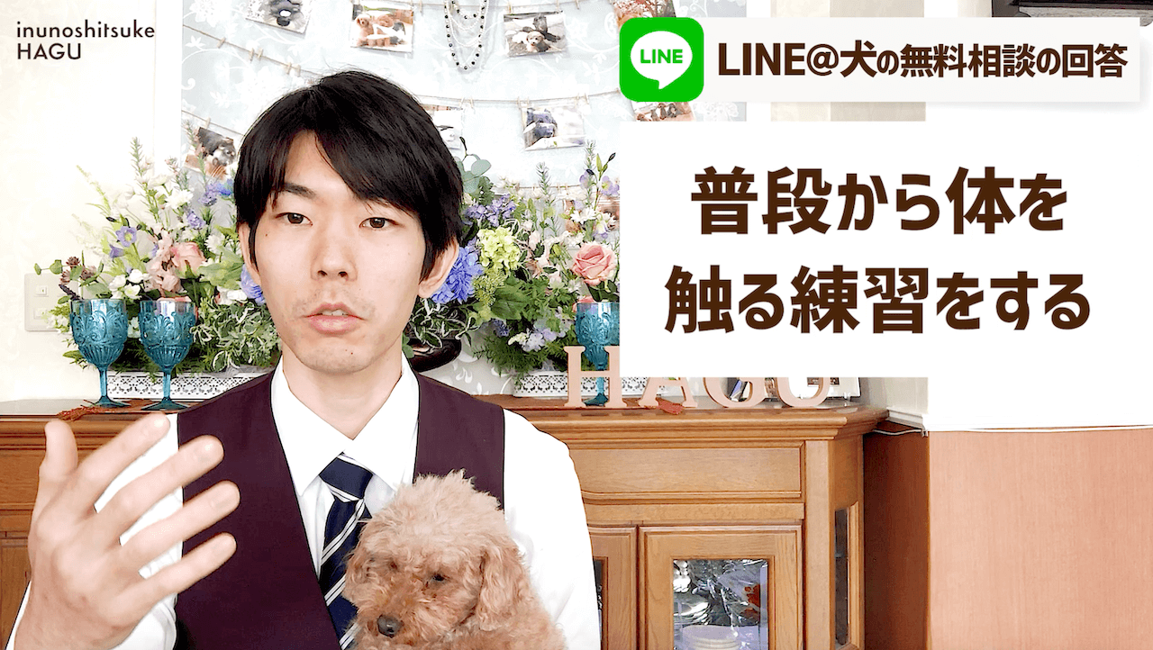 マテの指示をかけて、体全体を触る練習を日々行いましょう。