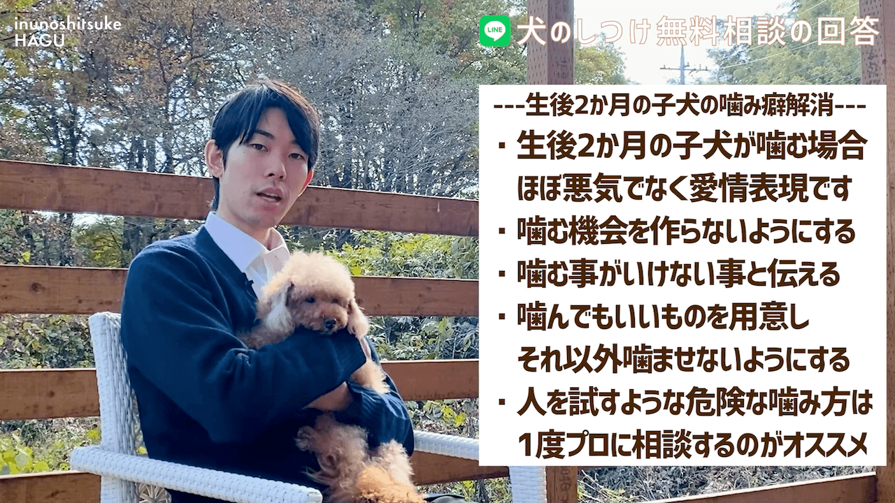 噛み癖は、他人にケガをさせてしまう危険性がありますので、プロに相談することをおすすめします。