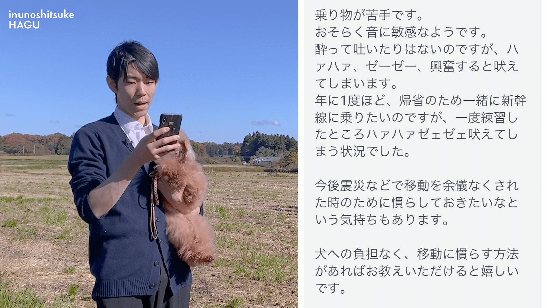 移動の時に怖がる場合には、入れ物に入れた状態で近所を歩く練習をしていただいて、犬の状態をみていただくことから初めてください。