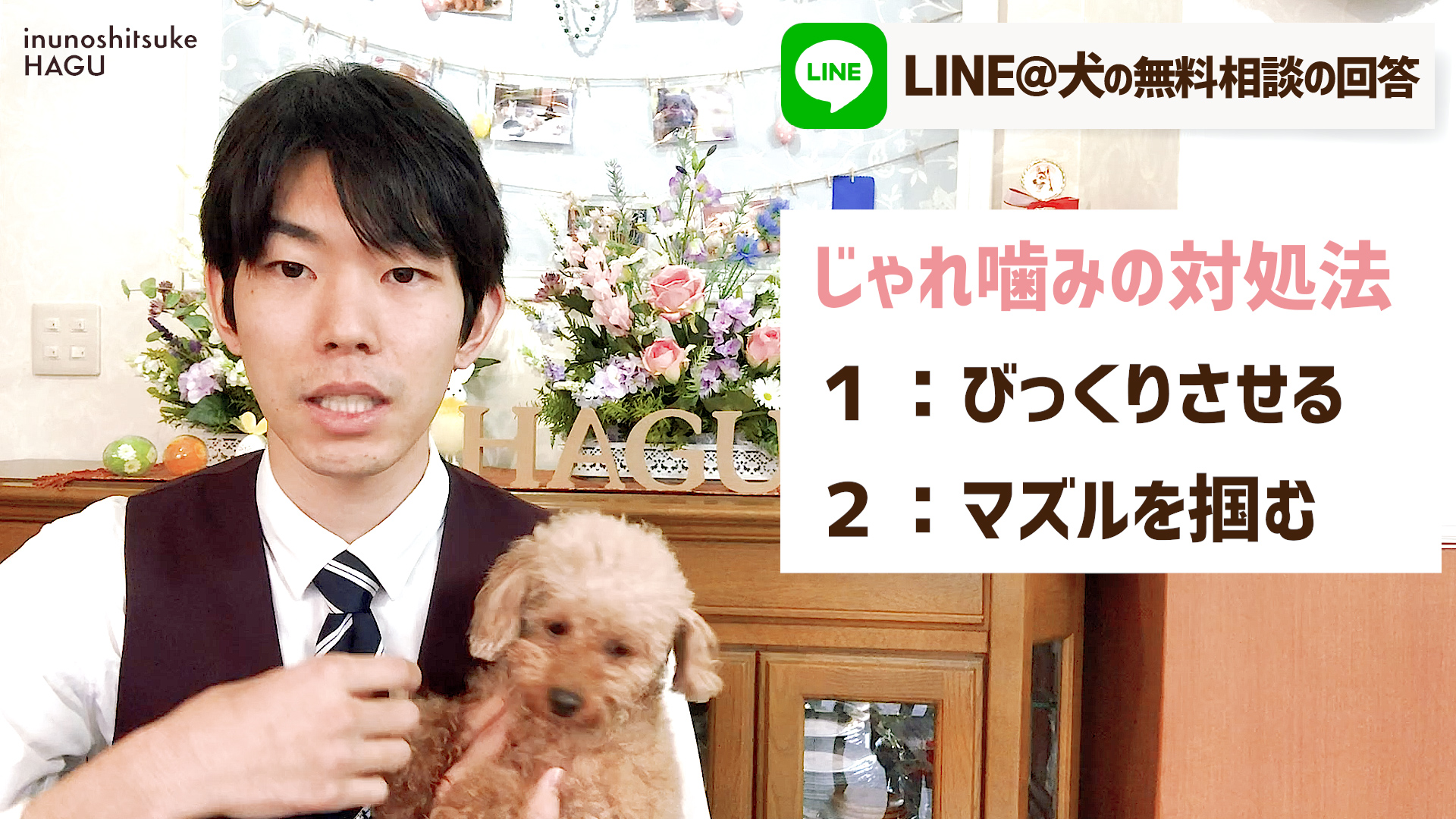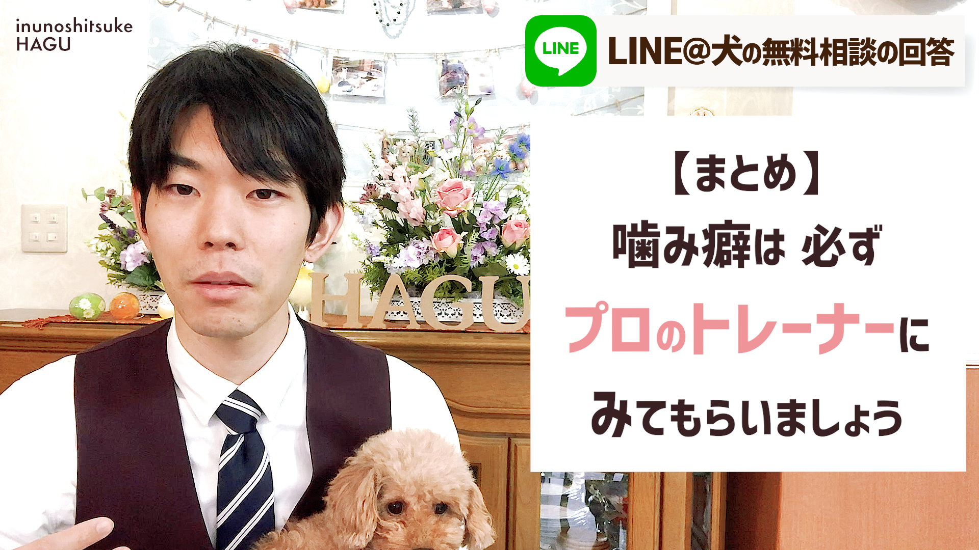 噛み癖はケガをさせてしまう可能性があり、とても怖いので、近隣のトレーナーの方に実際に見て頂くと、確実に対処することができます。
