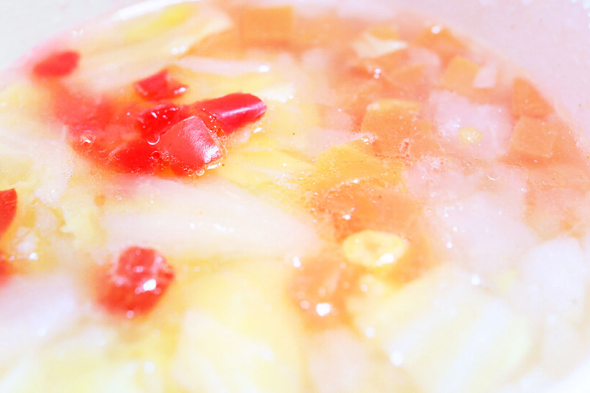 3. 1.の材料とだし汁を合わせて、レンジで温めてもいい容器に入れて、2分程度加熱します。食材が柔らかくなっていたら、更に大根の葉っぱのみじん切りをいれて更に1分加熱して出来上がりです。