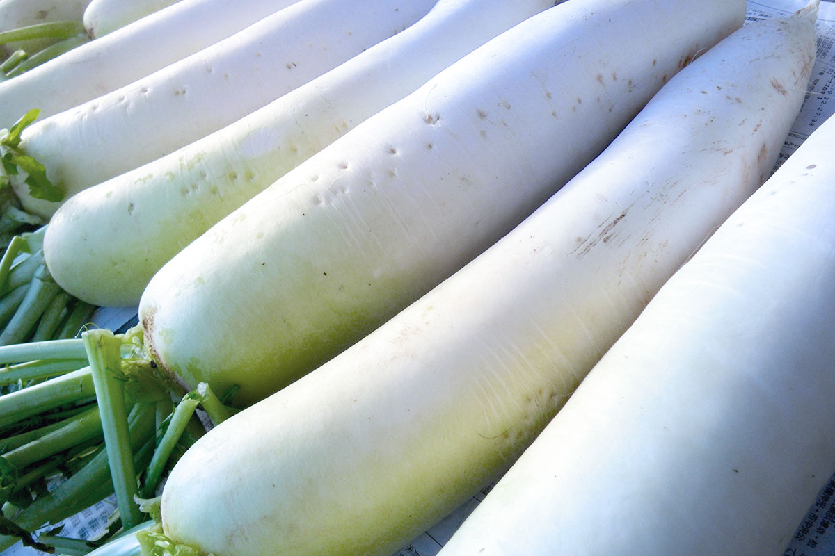 お鍋やおでん、煮物など冬のあったか料理に欠かせない大根は、犬にもおすすめの食材です。大根に含まれるビタミンCやカリウム、ミネラルが豊富です。大根には、「ジアスターゼ」という、でんぷんを分解する酵素がふくまれているので、かぼちゃやさつまいもなどと一緒に調理すると、消化を助けてくれます。根菜である大根には、体を温める効果もあるので、寒い冬にぴったりの食材です。